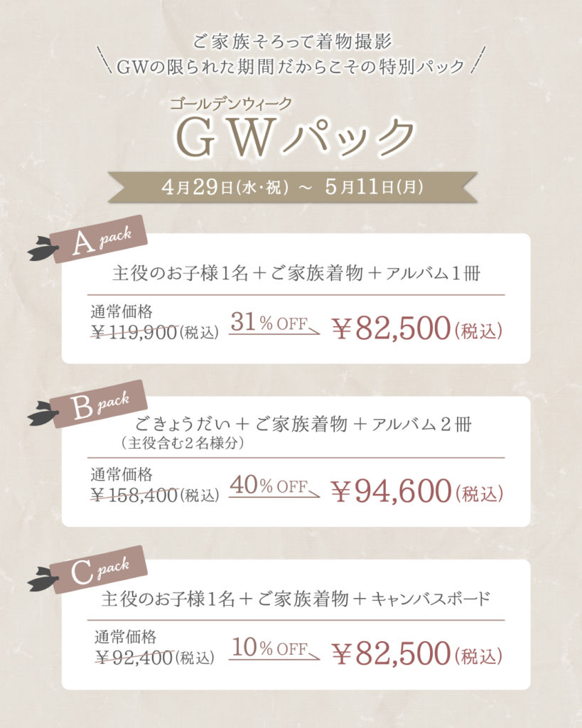 ご家族そろっての七五三撮影に、必要なものが全て詰まった「GWパック」を期間限定で販売いたします。