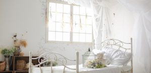 レースとリネンのベッドサイドには鳥かご こっそり覗きたい秘密の研究室 少し大人なフレンチモロッカンスタイル
